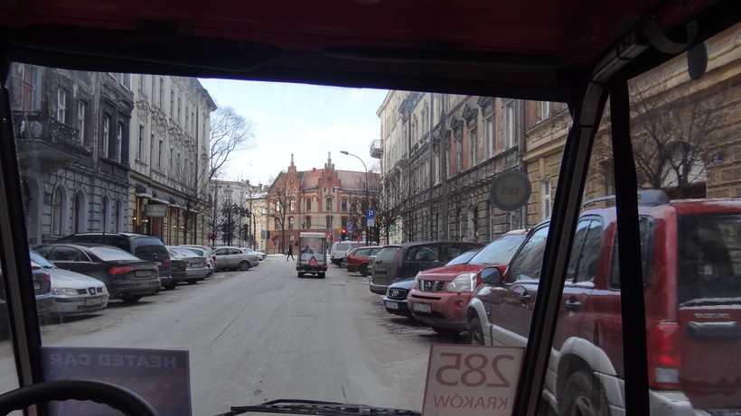 Добирался я туда из центра старого города на целлофановом экипаже с аудиогидом. Это такой фургонообразный мини-автомобиль, «корпус» которого выполнен из прозрачной пленки, которая застегивается на молнию. По-моему, внутри может человек 5 разместиться, помимо водителя. Там есть русский аудиогид, и там достаточно тепло, что было очень актуально, так как в Кракове мороз достигал 15-20 градусов.