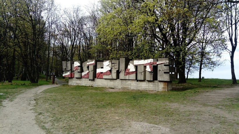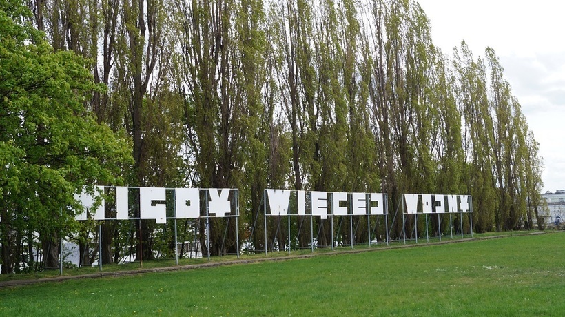 Сам памятник находится на горе, и к нему нам предстояло подниматься уже пешком. Преодолев несколько лестничных пролетов, мы оказались в заветном месте. Какой же оттуда красивый вид! Можно бесконечно любоваться на зеленый берег и огибающую его Вислу. А на широком поле перед памятником из больших железных букв сложена фраза: “Война: никогда больше” (приблизительный перевод с польского).