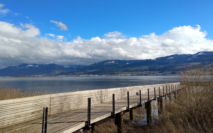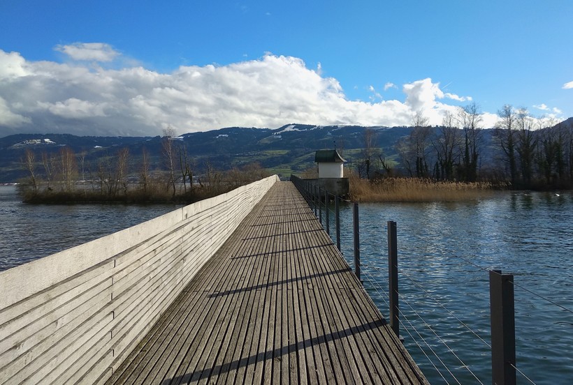 За дамбой справа виднелся какой-то мост, и я отправилась изучить его. Прямо посреди озера был вот такой пешеходный деревянный настил, который по карте соединяет город Рапперсвилль-Йона и дамбу где-то в ее центре, ближе к городу Хурден. С этого моста-настила открывался потрясающий вид на озеро и населенные пункты в подножии гор.