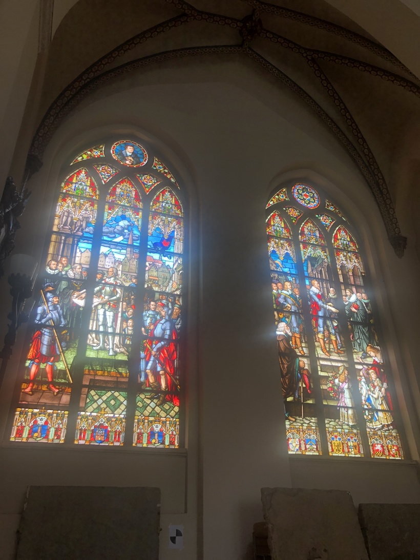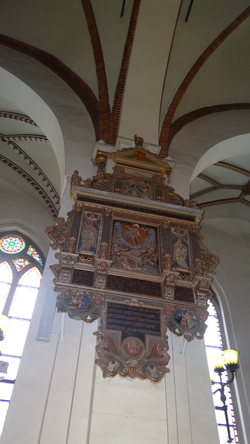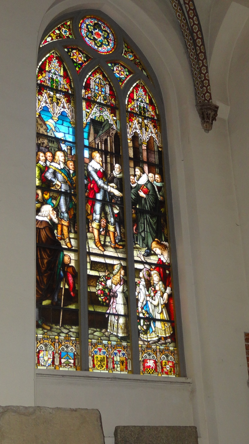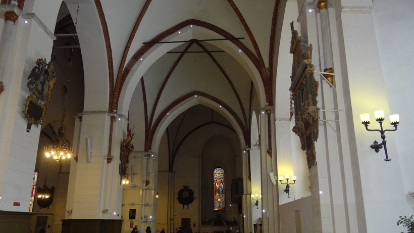 - Интерьеры. Помимо витражей, надгробных плит и очень красивого органа, обращает на себя внимание обилие гербов на стенах. Гербы все разные, и хороший экскурсовод наверняка может многое о них рассказать, как и случилось в нашем случае.