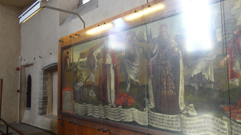- Внутри располагается музей средневекового искусства. Главным экспонатом является полотно «Пляска смерти» конца XV века. Оно действительно интересное и создано не без толики черного юмора. В то же время, вполне допускаю, что на кого-то эта картина может подействовать угнетающе, так как основной ее посыл в том, что перед лицом смерти все равны. Да и сама пляска со скелетами многим наверняка покажется жутковатой. Собственно, во многом ради этой картины я туда и пошел. Среди других экспонатов старинные надгробия, посуда, деревянные скульптуры и т.п.