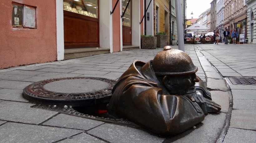 Это бронзовая фигура человека в каске, примерно на четверть своего роста вылезшего из канализационного люка. При этом я не могу сказать, насколько выполнена нижняя часть братиславского сантехника, но при взгляде на него создается впечатление, что он именно вылезает из канализации, то есть отверстие в земле настоящее и достаточно глубокое.