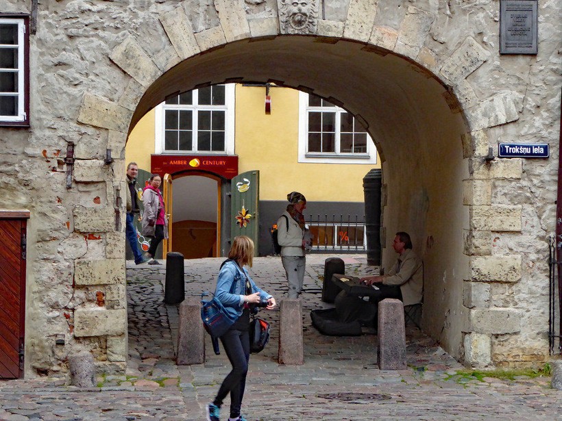 Многие заходят в ворота со стороны казарм Екаба, однако я всегда вожу гостей другим путем. Либо по узенькой улице Трокшню, очаровательно раскрашенной в разные цвета и яркой даже в унылом рижском феврале, либо вдоль городской стены, но, опять же, не со стороны казарм, а - наоборот. Там лежит ну очень аутентичная брусчатка, почти никто не ходит, стоят старые дома и склады - словом, ты уже погружаешься в атмосферу средневековой Риги и чувствуешь, что сейчас с тобой что-то хорошее произойдет. А потом мы выходим к Шведским воротам. Там постоянно сидит какой-нибудь музыкант, особенно любят эту достопримечательность ребята с кокле - латышским аналогом гуслей. Народные мелодии вплетаются в разговоры, и вот нужное впечатление получено, вуаля.