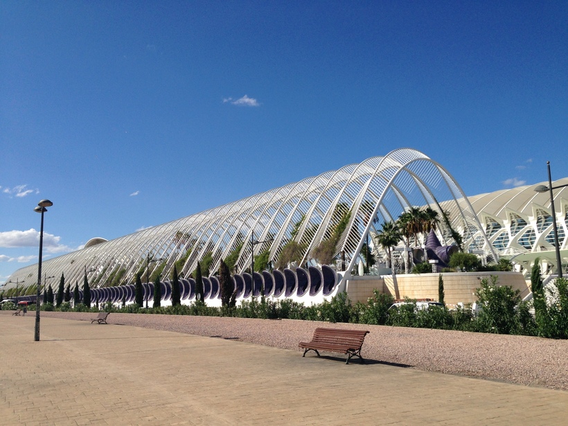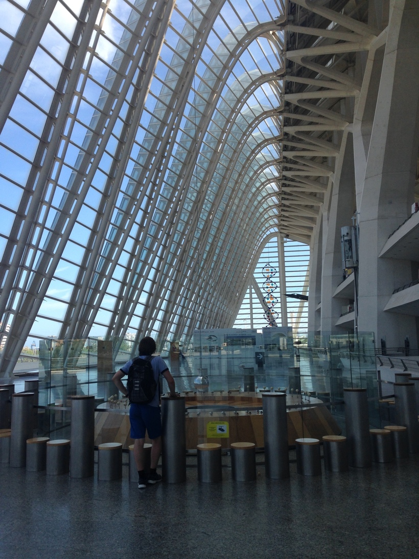 Это футуристический комплекс, расположившийся в Валенсии, который состоит из нескольких зданий: Океанографического парка, 3D-кинотеатра «Hemisferic», Музея науки Принца Филипе, оранжереи, Дворца искусств королевы Софии. Это место очень необычное, захватывающее. Огромные белоснежные сооружения комплекса окружены бассейнами и растениями, а внутри не менее интересно, чем снаружи. Сюда мы приезжали дважды: в первый день посетили Океанографический парк, который считается одним из самых крупных океанариумов в Европе, а на другой день пошли в музей имени принца Фелипе.