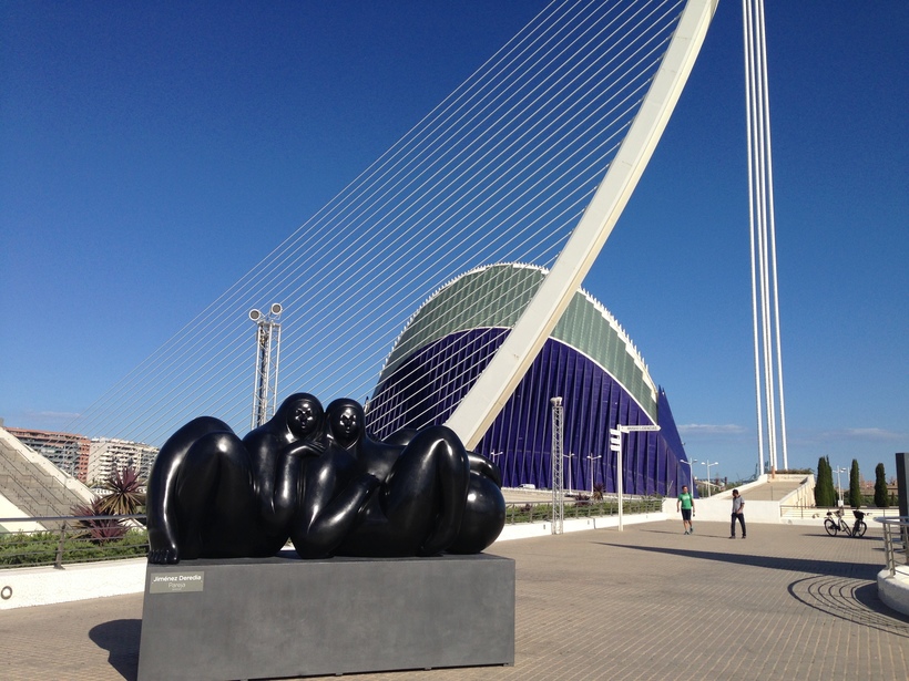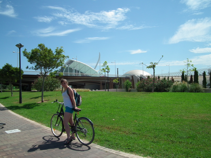 Мы с мужем взяли велосипеды на прокат в старом городе и отправились в «город новый». Кстати, велосипедную прогулку вполне могу рекомендовать. Мы прокатились сначала по исторической части Валенсии, а потом направились в Город искусств и наук. Ехали через парк в старом русле реки Турия, который тянется через весь город. На территории комплекса есть специальные места для того, чтобы оставить велосипеды.