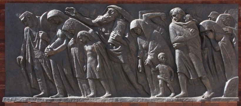 С восточной стороны памятника можно увидеть удручающую картину, от которой сжимается до боли сердце - люди идут толпой, старики, дети, женщины, мужчины. Так их гнали в гетто и концлагеря. Люди выглядят обреченно, они смирились со своей участью и даже не пытаются сопротивляться, они знают, что впереди их ждет смерть. Кто-то умрет быстро, кого-то будут ждать мучения и пытки. Но в лицах этих людей нет ни капельки надежды. Смотреть на эту сторону мемориала мне было очень горько и больно. Я прямо ощутила себя на их месте - одиноко бредущую, отчаявшуюся и сломленную.