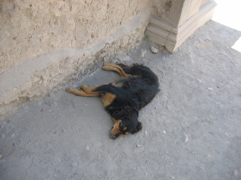 Стояла адская летняя жара и, бродя между каменных домов и колонн, я набрела на собачку, вид которой вызвал у меня улыбку, ей тоже было жарко.