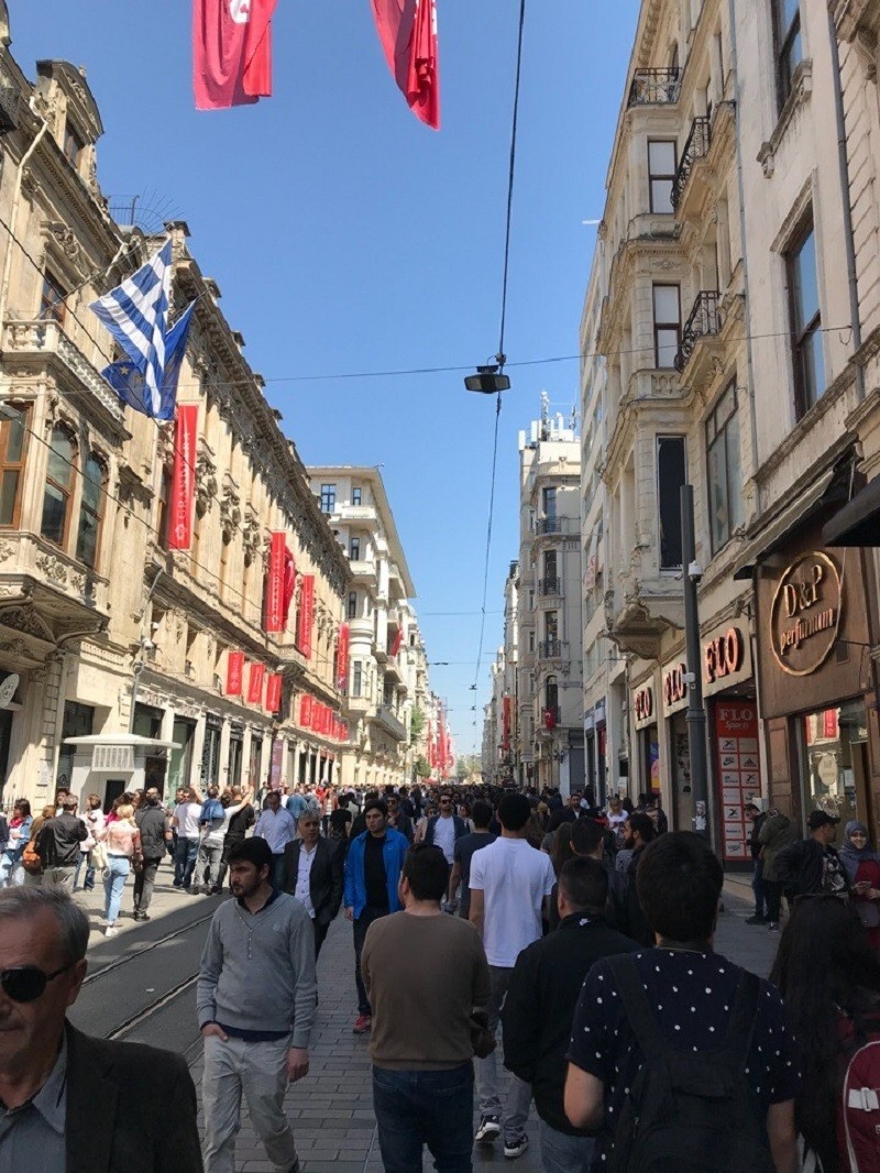 Кстати, в мою третью поездку, мы выбрали отель поближе к этой улице, хотели насладиться атмосферой постоянной движухи). Жили рядом с лицеем Галатасарай. Отели были дороже в этом районе, по уровню хуже, чем в районе Султанахмет, за те же деньги, но это было интересно. И рядом с лицеем мы нашли прекрасное кафе - "Teras cafe", где самый вкусный менемен, который я ела в своей жизни и отличный вид на город! Обязательно загляните туда.