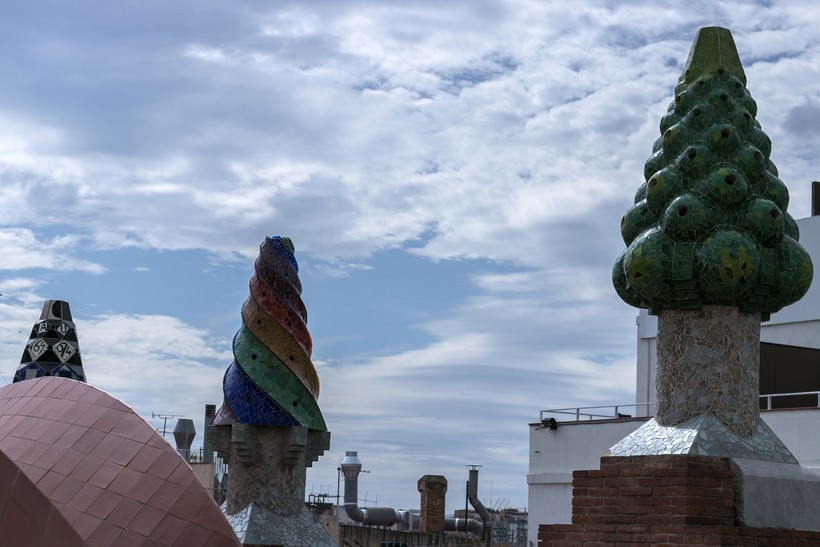Сразу скажу, что в дождь на крыши всех зданий Гауди не пускают по соображениям безопасности. Там скользко. Нам повезло, был солнечный день, и мы с удовольствием вышли на данную крышу. Стоит ли упоминать о красочных дымоходах, которые стали определённым символом стиля Гуади? Эти дымоходы вы можете увидеть и с улицы, но вблизи возможно рассмотреть мозаику. Потрясающей красоты каждая башенка и каждая уникальна. И если конюшня у меня ассоциировалась с корнями, то тут на крыше явно – цветочки.
