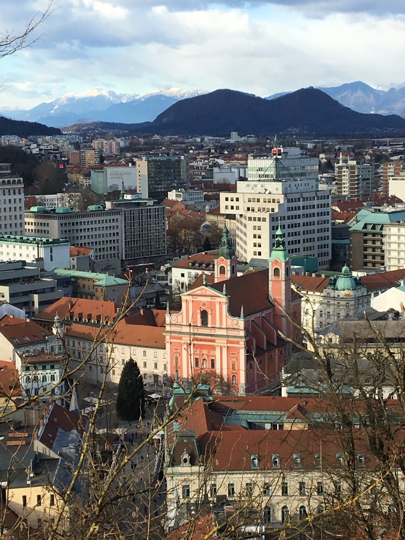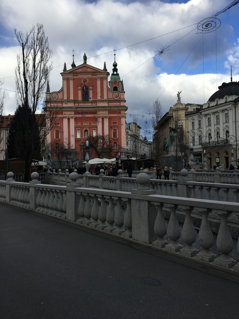 Любляна это чудный городок в Европе, который я посетила на новогодних каникулах. Так восхитительно посещать новый город первый раз. Выйдя из автобуса, который привёз меня с аэропорта, на автобусной станции, я шла медленно, разглядывая пока незнакомый город. В начале пути особенно не было ничего из достопримечательностей, но постепенно появились интересные дома, крохотный сквер. Так я вышла к яркой церкви и незаметно, и достаточно быстро, оказалась на центральной площади Любляны - Прешерне. От вокзала путь занял всего минут 10-15.