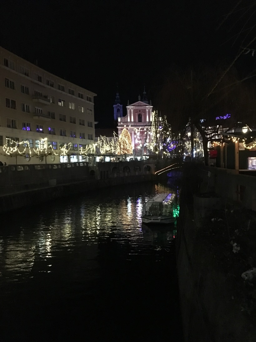 Вечером, когда стемнело, я пошла гулять и посмотреть новогоднюю иллюминацию. Елка посреди площади ярко сверкала фонариками. Все здания были подсвечены. И на площади выставили столики и открылись ларьки с разнообразной едой, которые днём были закрыты. Атмосфера была праздничная. Маленькая Любляна и её центральная площадь, на мой взгляд смотрелись очень неплохо.