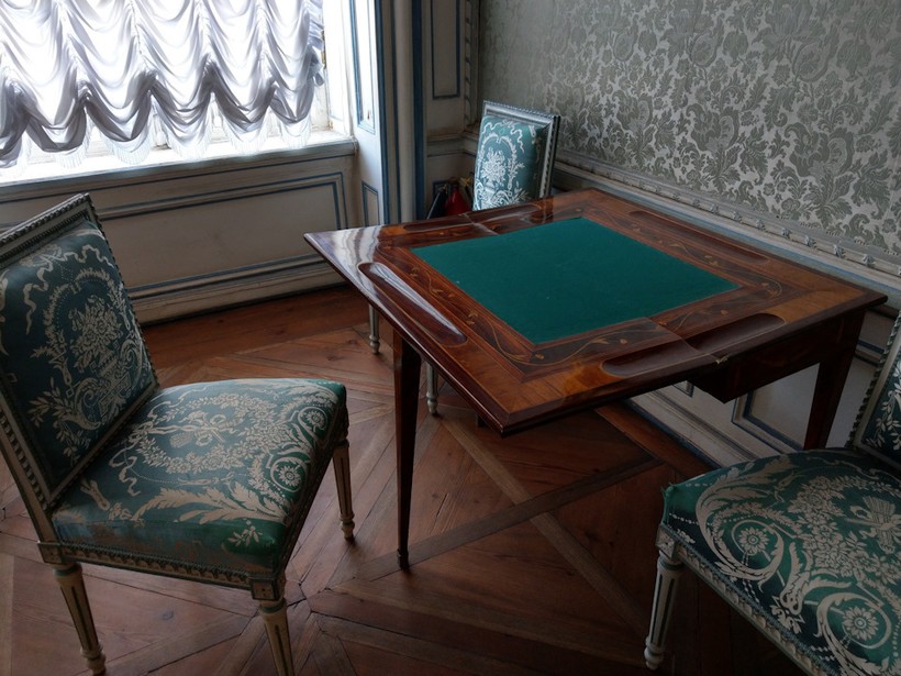 Стулья и столы тоже остались в первозданном виде, здесь я узнала, что такое ломберные столики – это игральные столы, и представляете, на них мелками, прямо на ткани, писали счёт игры, но их состояние настолько было шатким, страшно было прикоснуться.