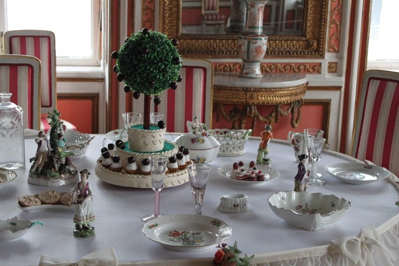 В столовой даже был накрыт стол, ну конечно, с имитацией настоящих фруктов, пирожных, настоящая фарфоровая посуда. Кстати, фрукты ставили на стол здесь исключительно из местного сада, парники, к сожалению, не сохранились.