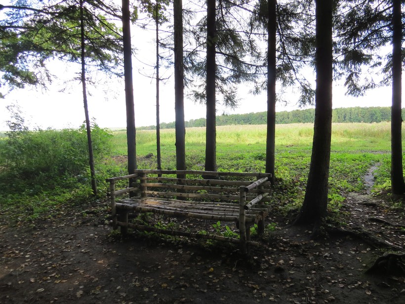 Такой же скромной предстаёт и любимая скамейка писателя, спрятанная с противоположной стороны леса, где он не редко писал и любовался ёлочками.