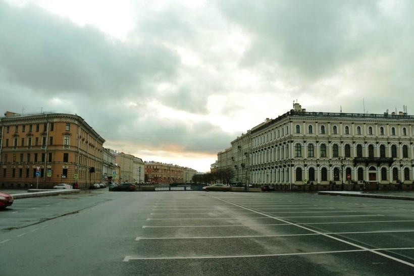 Значительная часть пространства заставлена автомобилями. Вид восхитительный: красавец Исаакий, Мариинский дворец, памятник Николаю I, изумительный обзор на Мойку.