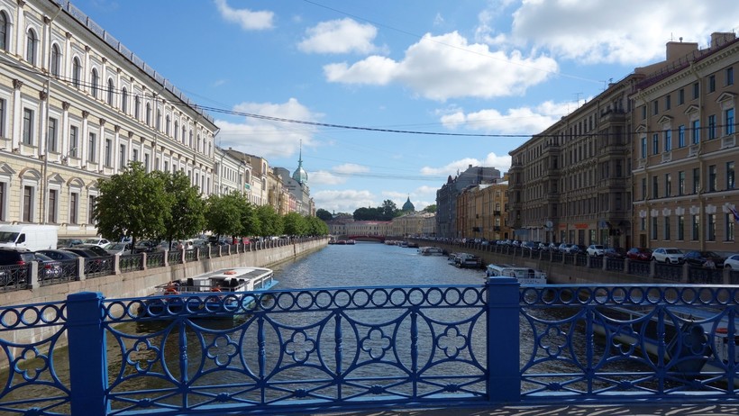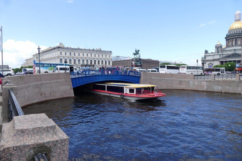 Альтернативный маршрут требует вложений – придется купить билет на водную экскурсию по каналам Питера. С воды проще опознать достопримечательность – яркая синева мостовых конструкций заметна издалека.