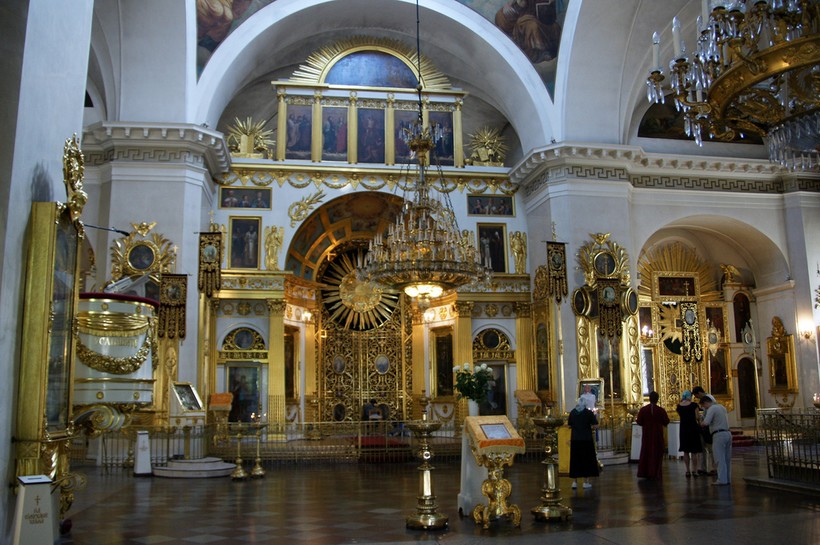 Алтарь и императорское место также были созданы по проектам Стасова. Если, стоя внутри, поднять голову, можно увидеть, что главный купол окрашен в небесный цвет, а посередине него находится звезда. Восхищает и большое церковное паникадило на 120 ламповых свечей.