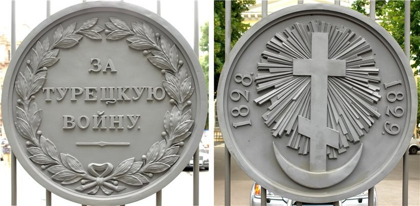 На главных воротах расположены круглые щиты с изображением медалей, вручаемых за победу в той русско-турецкой войне.