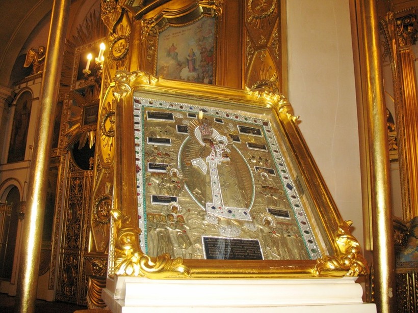 Вторая икона, о которой я хочу рассказать — образ Пресвятой Богородицы, называемый «Всех Скорбящих Радость»Исполнена она была в 1711 году по велению сестры Петра Великого Наталии Алексеевны. Святыня часто сопровождала русские войска во время военных кампаний. В соборе икона пребывает с 1932 года.