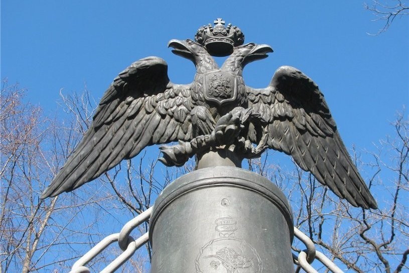 Средние стволы украшены коронованными двуглавыми орлами, а отдельные элементы соединены между собой мощными цепями.