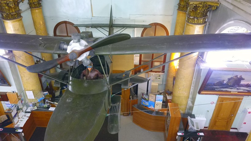 Как человека, далекого от истории и цифр, меня удивили больше не даты из истории освоения Арктики и Антарктики, а некоторые экспонаты. Как например, вот этот кукурузник. Он встречает вас прямо при входе и висит над вашей головой в натуральную величину.