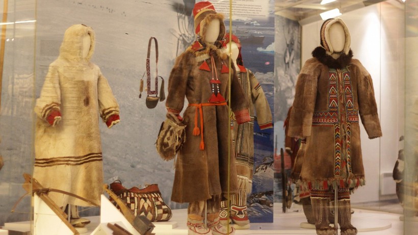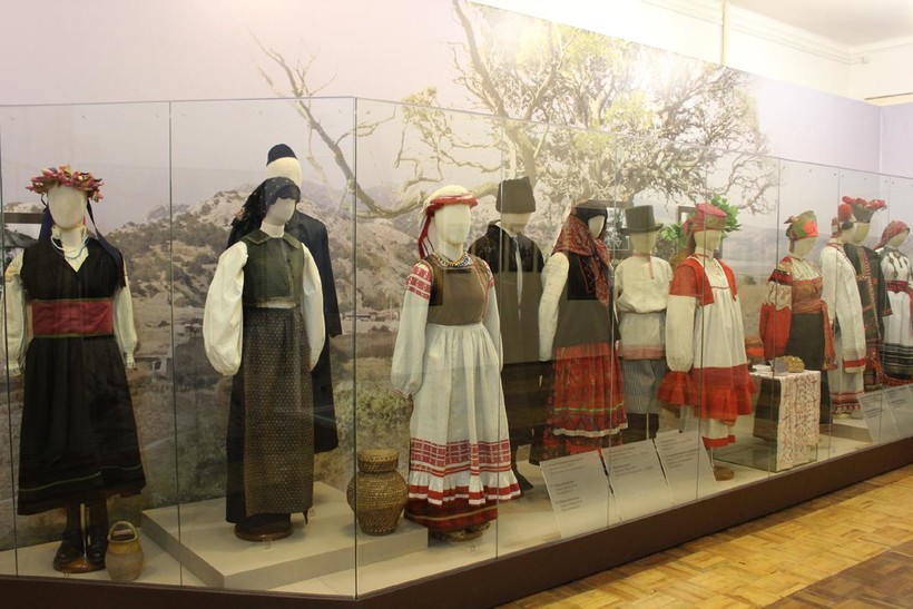 Мне особенно нравится разглядывать национальные костюмы. Большинство из них надеты на манекены, часть из которых размещена в традиционной обстановке. Т.е. в витрине воспроизведена атмосфера крестьянской избы, эскимосского чума и т.п. Сценки такого рода всегда дополняются утварью, сельскохозяйственными инструментами, рыбацкими вершами и т.п. инвентарем. Это придает коллекциям живописный вид, не позволяет посетителям скучать, как порой бывает в музеях.
