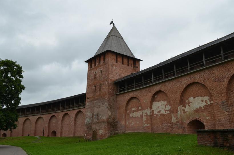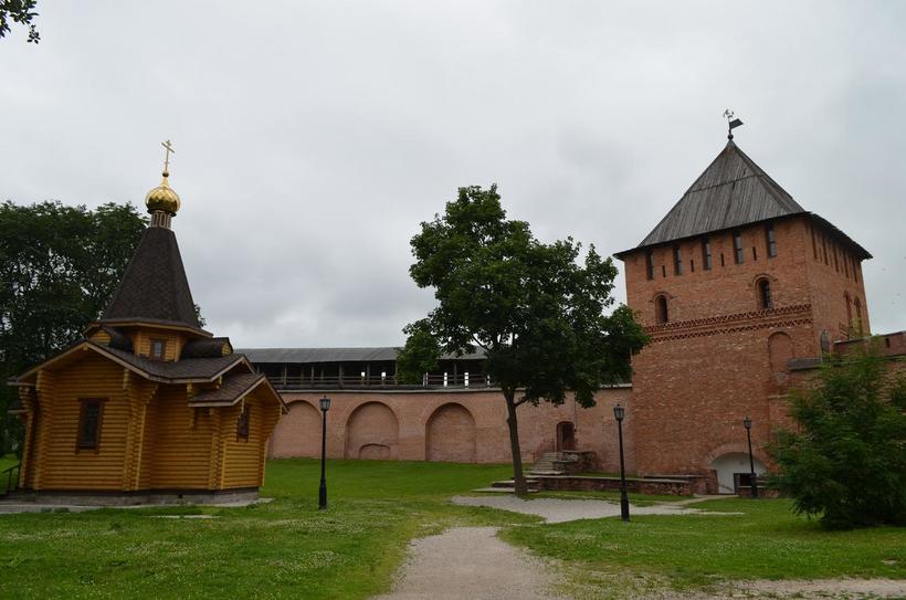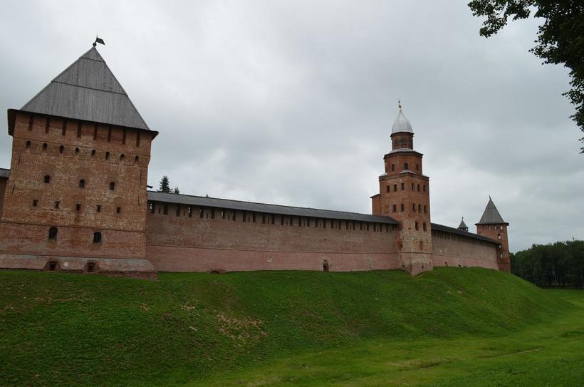 Что делать. Не торопиться идти внутрь крепости, сперва обойти её со всех сторон, оценить размеры башен и стен. Выглядят они потрясающе, хоть сейчас кино про Древнюю Русь снимай! Лучше не думать о том, что исторический Детинец был деревянным, и от него ничего не сохранилось. Те стены из красного кирпича, что окружают цитадель, построены в основном в конце XV века, а некоторым ещё и тридцати лет не исполнилось. Хорошо, что реставраторам удалось восстановить те участки, которые обвалились в 1991 году. Новгородцы тогда думали, что крепости настал кирдык.
