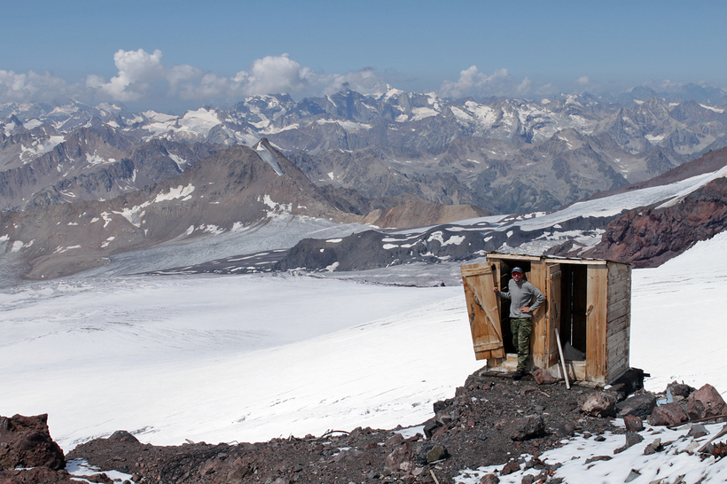 День 3. Поднялись до Приюта 11, заселились. Этот приют построен более основательно, чем Бочки, он двухэтажный, с каменным основанием, есть кухня и вот такой зачетный сортир.