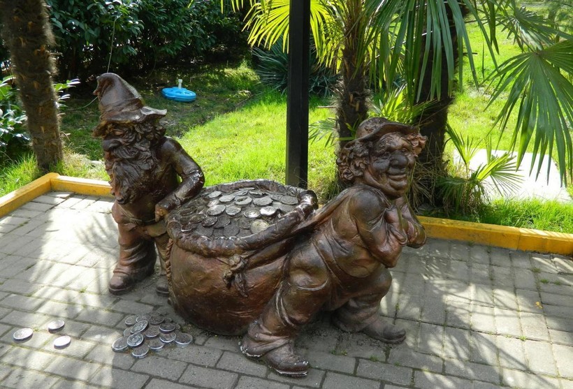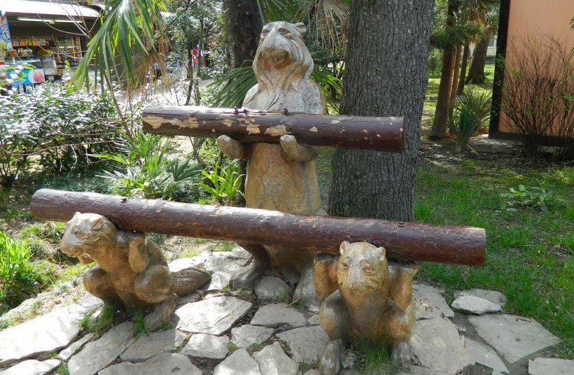 Под громким названием «аттракционы» подразумевались карусели, что помнили лучшие времена. Нет, кататься было можно, только цены для такого оборудования были высоковаты. Да, ярко, красочно, подсветка вечером, но сеансы коротенькие, сопровождающиеся скрипом старых механизмов. Детям нравится — родители счастливы. Очень много разных сувениров, продавцы ловят почти за руку, предлагая свой товар. На каждом шагу разные забегаловки, лотки с мороженным и сладкой ватой — денег нужна прорва, хотя есть бюджетные кафе, типа столовой, где довольно вкусная кухня. Главной «развлекухой» считается дельфинарий, куда мы не пошли, ведь только день назад посетили аналогичный. Просто пошли бродить по аллеям, где росли различные растения, прятавшие под собой забавные фигурки.