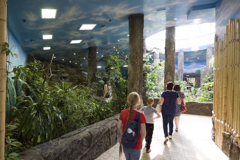 На втором этаже ещё и пресмыкающиеся, некоторые виды птиц, всё сделано в стиле джунгли, на стенах висят африканские маски. Здесь контакт с животными открытый, но осторожно, попадаются и кусачие!