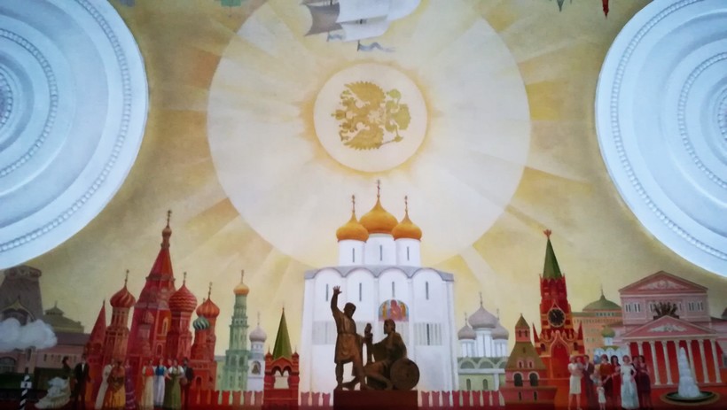 Изрядную долю времени, проведенного в зале вокзала, мы рассматривали потолок – на нем изображены разные эпизоды из российской истории, известные места страны. Они очень гармонично объединены в одно полотно, из которого можно один за одним взглядом «вынимать» отдельные элементы. Пожалуй, пока шея не заболит.