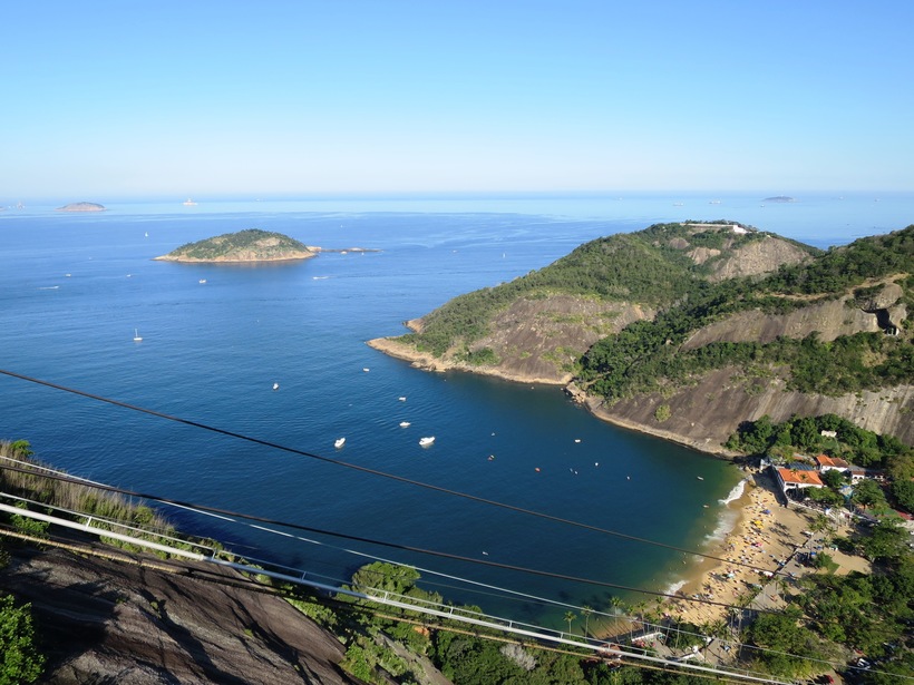 Подьем на гору осуществляется по канатной дороге. Это первый из построенных фуникулеров в Бразилии и ему уже 106 лет. Удовольствие это не из дешевых - почти 30 долларов, но оно того стоит. Пока поднимаешься, отрывается обзор на красивые пляжи и, постепенно, на весь город.