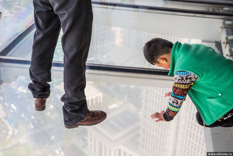 Я даже и не заметила сначала стеклянный пол, потому что на нем лежали туристы на каждом свободном сантиметре. Но позже я нашла свободную нишу и... не смогла на нее шагнуть) Пришлось ползком залезть на стекло, сфотографироваться и так же ползком слезть. Не думала, что мне станет страшно, но факт остается фактом) Как-то так это происходило))
