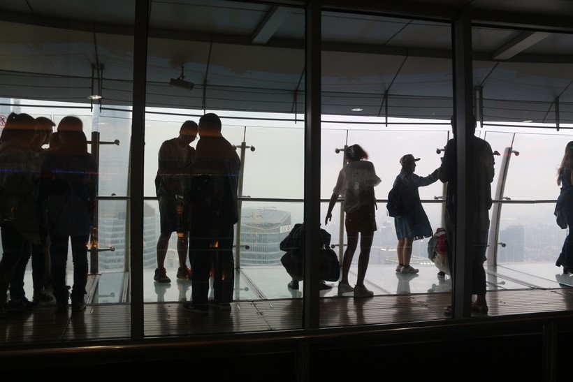 Народу много. Все фотографируются и ползают по стеклянному полу. К слову, на этом этаже стена из стекла не доходит до потолка, поэтому сверху задувает нехилый такой ветер.