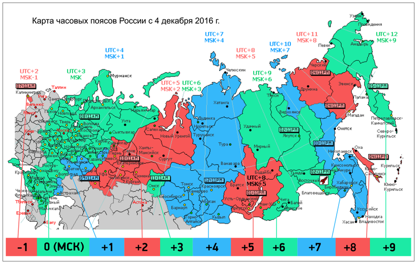 После внесения очередных поправок в закон в 2016 году Россия стала обладательницей 11 часовых поясов. Основным ориентиром остается московское время. Остальным регионам приходится самостоятельно высчитывать расхождение.