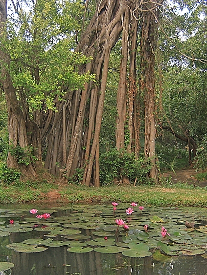 В некоторых бассейнах все еще есть вода и цветут лотосы. Вокруг порхают бабочки и скачут шустрые лангуры.