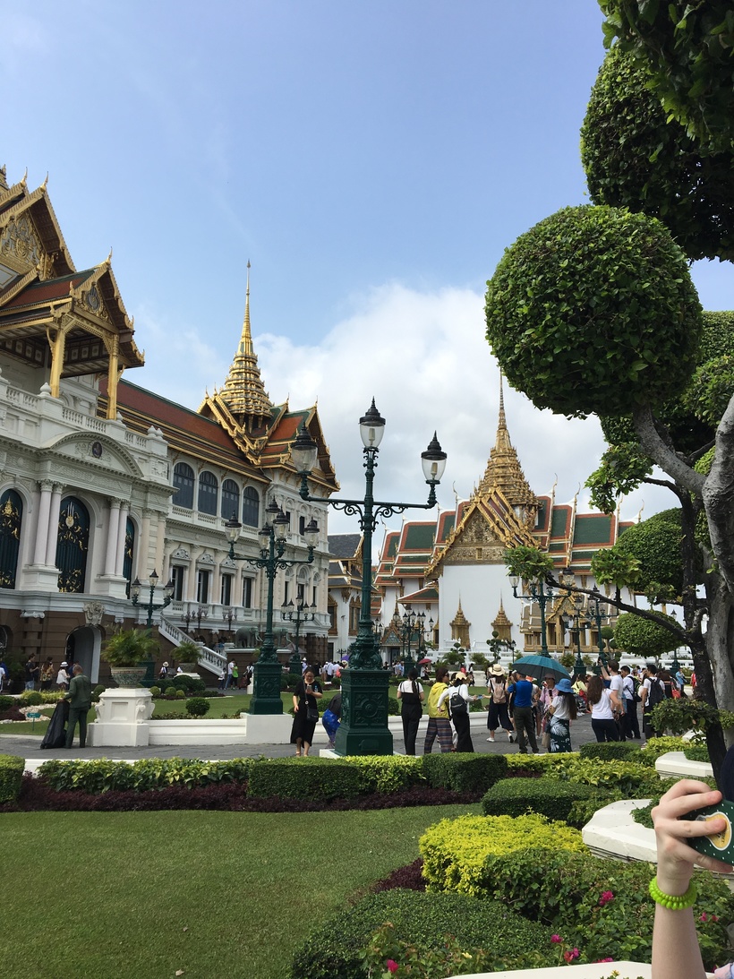 Мы поехали достаточно рано, практически к открытию. Но таких толп туристов, я не видела нигде. Очень мало европейских лиц, в основном азиаты и наверно из разных стран, потому что стиль одежды у всех был разный. Вход на территорию комплекса разрешён только в закрытой одежде, никаких шорт и голых плечей. Купив билеты, мы вошли на территорию комплекса, который называется Большой королевский дворец.