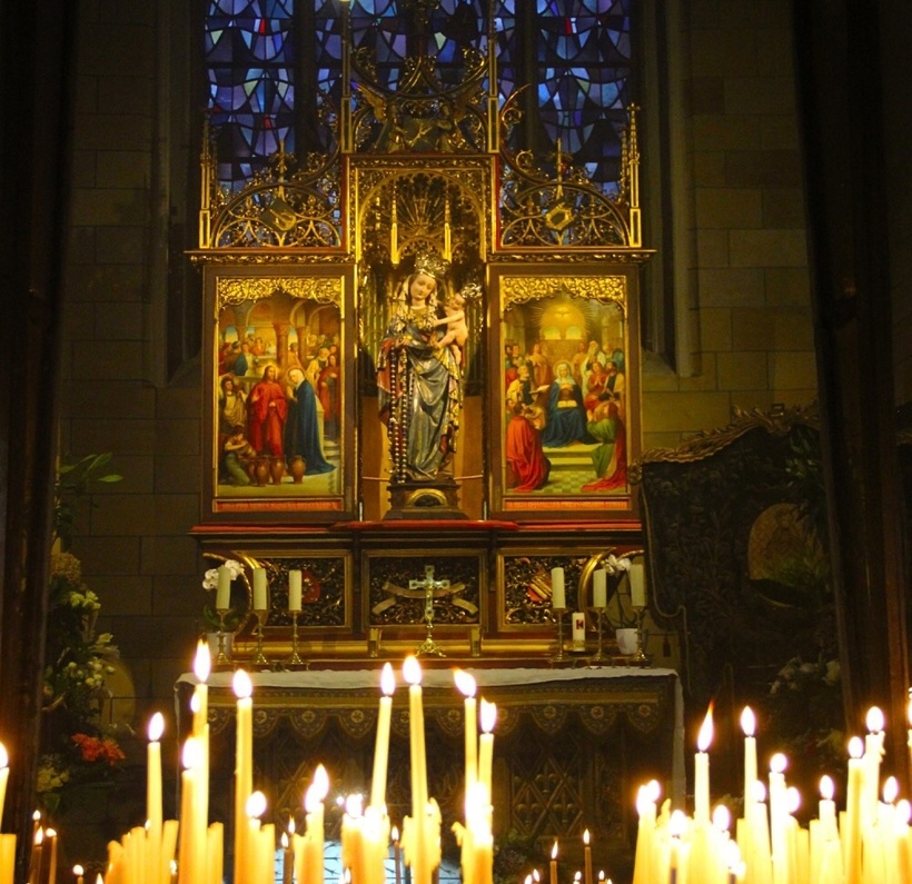 В церкви можно купить свечи и поставить их перед иконой или скульптурой Иисуса Христа, Девы Марии.