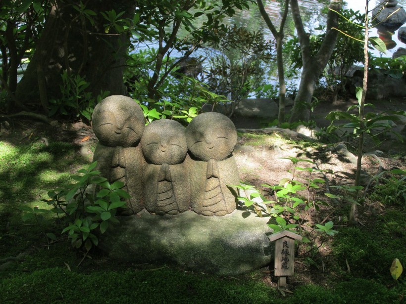 Это Дзидзо - духи-хранители душ нерожденных детей. Вообще, их можно увидеть почти в каждом японском храме, часто их "украшают" красными шапочками и передничками. На самом деле, когда начинаешь задумываться, их количество ужасает.