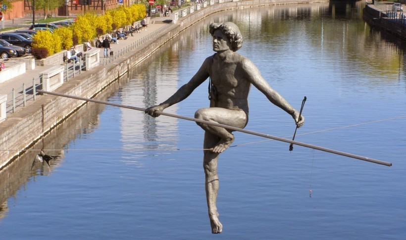 Даже глядя на этого бронзового канатоходца, кажется, что еще секунда, и он рухнет в реку.