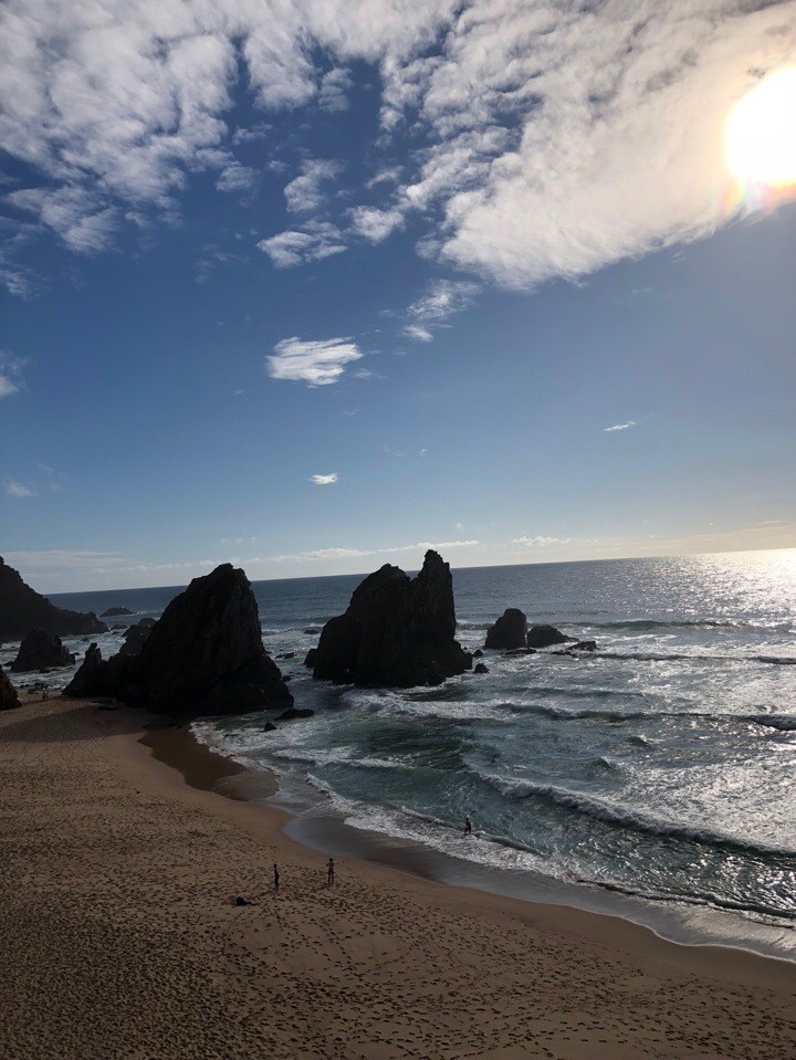 Держите путь на мыс Рока, до него можно доехать автобусом от города Синтра. Как прибудете на место будьте внимательны - до самого пляжа ведёт грунтовая дорога, на машине ехать не советую. Ориентируйтесь на дорожный знак " Ursa" - это точка старта и он же начало грандиозного приключения. Сразу предупреждаю, ваше спасение это удобная обувь ( никаких сандалей и сланцев). Пройдя несколько метров, вы окажетесь на развилке, не спешите постойте и наслдадитесь прекрасным видом, послушайте крики чаек и вдохните полной грудью океанский бриз. Теперь важная информация, если вы не хотите лишиться ног, головы и других важных частей тела не идите НАПРАВО. Я вам советую, как человек, который совершил эту ошибку, и , хотя , это не первый мой спуск, я реально очень очень боялась, что не дойду до пляжа. Другое дело путь левее, вам предстоит преодолеть крутой спуск, но это не так страшно. Просто подготовьтесь к физической активности.