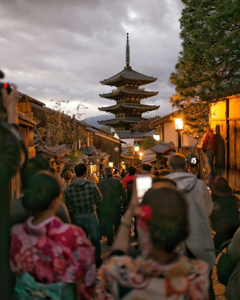 Самая красивая улица, которая будет на многих открытках это Ханами Коджи (название уже намекает, когда здесь максимально красиво - в цветение сакуры). А самое популярное место оказалось вид на пагоду, уже заходило солнце в 4 часа, и ту толпу которую мы увидели на самой популярной обзорной точки вызвала у меня панику. Столько штативов сразу я не видела даже в магазинах фототехники - все эти люди пытались поймать идеальный момент для фотографии!