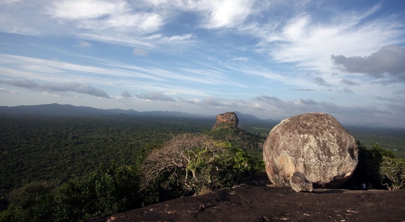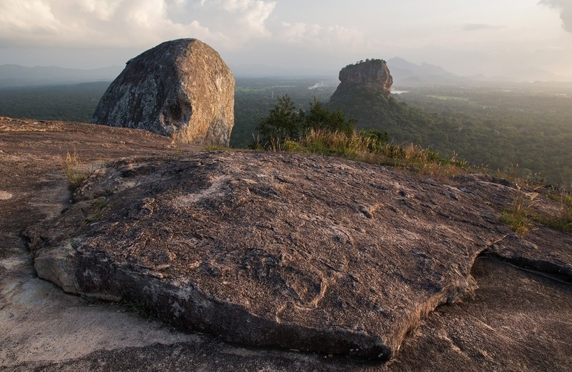 На подъем мы потратили около 40 минут. Ещё 20 минут на осмотр Пещерного храма. Но то, что мы увидели на пике горы, с лихвой окупило все мучения и испытания во время подъема на Пидурангалу. Если у вас есть свободные пара-тройка часов, и хорошая физическая подготовка, то надо обязательно подняться на Пидурангалу. Отсюда открывается отрясающий вид на джунгли и скальный комплекс Сигирия. Сочетание плоской поверхности горы, обработанные ветром и временем валуны, а в особенности огромный Царь-валун, как фишки в большой игре великанов.