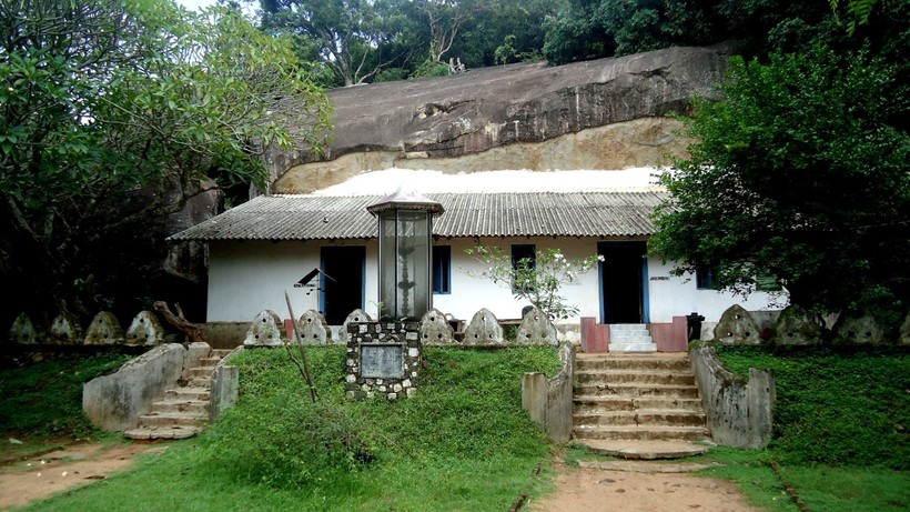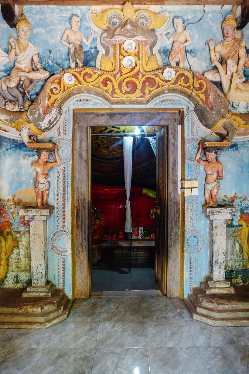 Итак, водитель, примерив роль проводника, повел нас куда-то вверх по лестнице в гору. По обросшим ступеням лестницы, чувствовалось, что место очень старинное. Сначала мы вышли на площадку со скромным храмом. Впоследствии мы узнали, что это Пещерный храм Пидурангала, где ещё в 5 веке нашей эры проживали монахи, которых выселили из Сигирии при строительстве знаменитого дворца Кашьяпы. Храм вписан в каменный грот - с трех сторон пристроены кирпичные стены. Входная группа оформлена в традиционном кандийском стиле - в виде огромной пасти льва. Внутри мы увидели несколько статуй Будды – сидящие, стоящие и одна большая лежащего. Потолок и стены расписаны орнаментом.