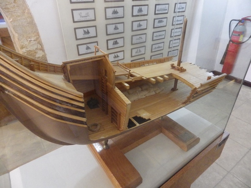 Он не очень большой, двухэтажный, в нём имеет место быть некоторое количество залов (также есть второе отделение – в конце гавани, туда входи по отдельным билетам и там стоят лодки). В первых залах были представлены морские карты, исторические карты Крита, там была поставлена модель маяка и рассказано, как работает огонь на маяке, а также там выставлены модели кораблей.