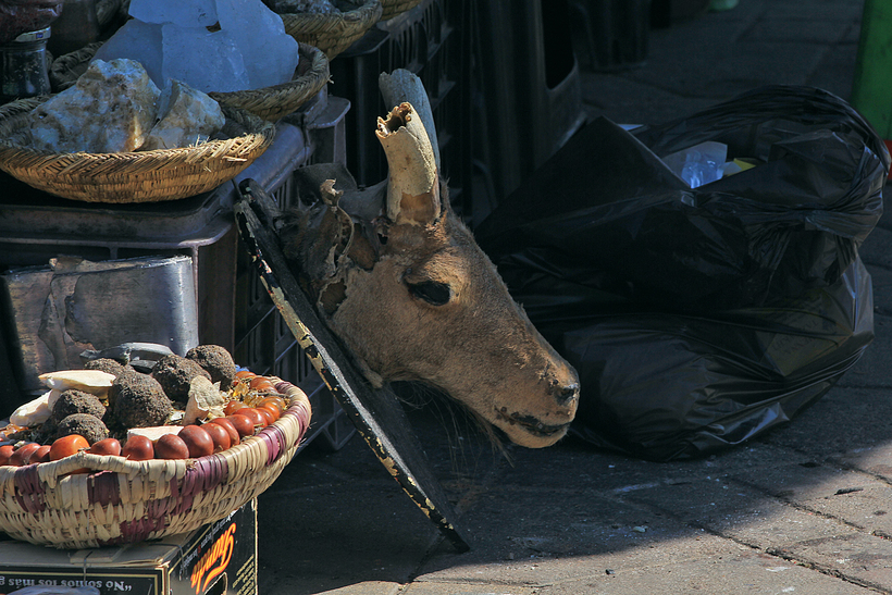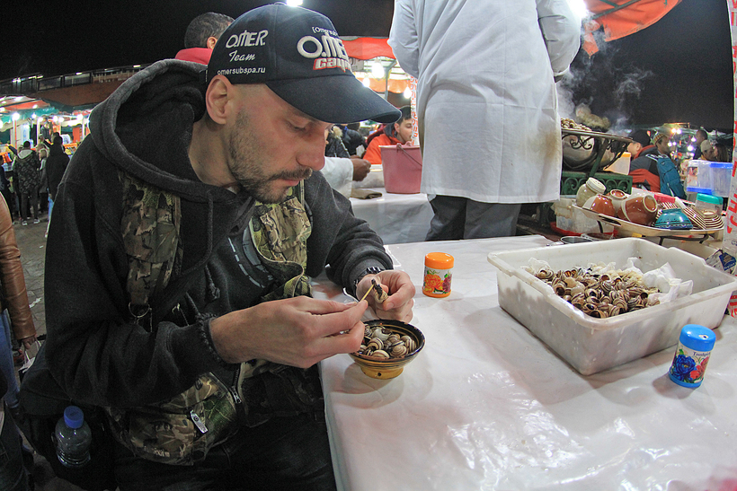 Мое знакомство с Марракешем началось не совсем обычным образом. А именно, с дегустации улиток на ночном рынке на площади Джема-эль-Фна. Причем это были не ставшие для многих привычными виноградные улитки, а какие-то мелкие черные, похожие на тех, что ползают у нас после дождя по дорожкам. Вот уж не думал, что их можно есть. На вкус редкостная гадость, но у туристов пользуется спросом.