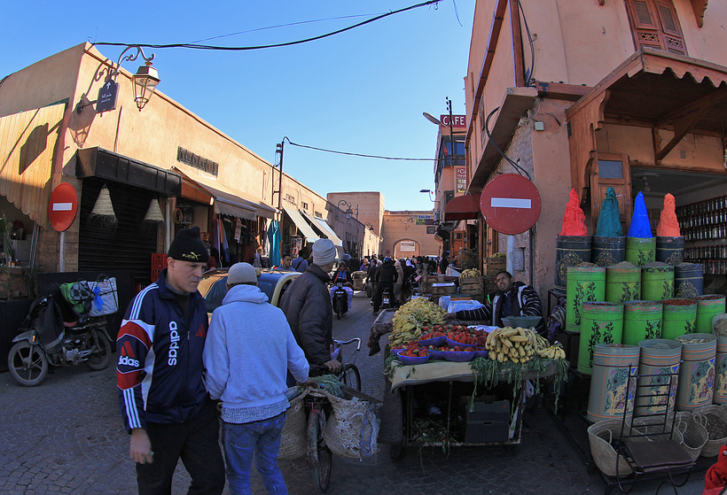 В хитросплетении улочек и дворов очень легко потеряться, и здесь очень выручила установленная на телефоне программа навигатора. На удивление, на закаченной карте были отмечены мельчайшие проулки. Когда мы сунулись в очередную узкую улочку, пытаясь выбрать наиболее короткий маршрут, местные мальчишки кинулись нам наперерез, стали говорить что-то типа «ты туда не ходи, ты сюда ходи, а то снег башка попадет… ну и так далее». Обычно я в таких случаях верю местным, но в этот раз решил довериться навигатору, и мы все-таки пошли по рекомендованной им улице. В итоге разозленные нашей неуступчивостью пацаны стали кричать нам вслед ругательства и угрозы. Не знаю, что это было, может они хотели получить денег за указание «правильной» дороги. В любом случае, это было единственным не совсем приятным впечатлением от Марракеша. В остальном и сам город, и его историческая часть очень порадовали.
