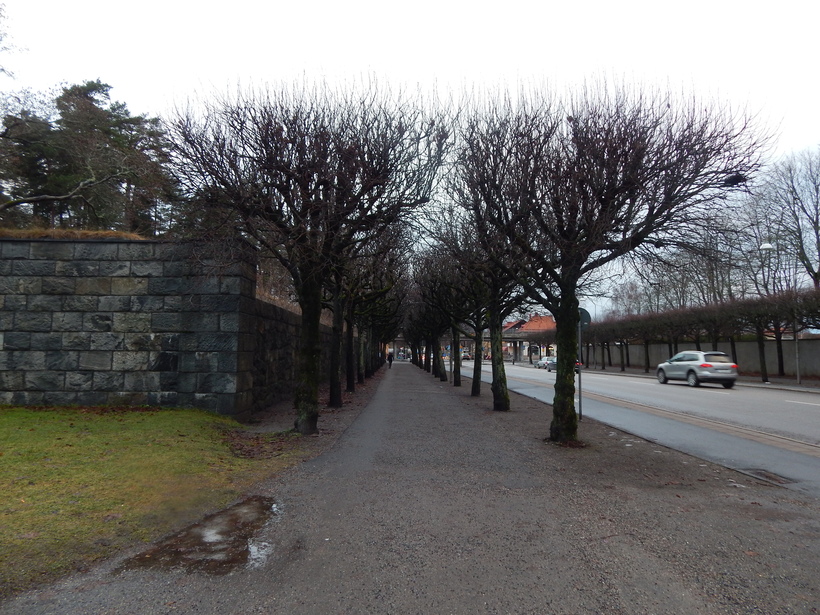 Лесное кладбище расположено у дороги, но огорожено, и внутри шума машин совсем не слышно, как будто ты и в самом деле в лесу. Добраться к нему можно, доехав до одноименной станции метро Skogskyrkogården, а оттуда – буквально несколько минут ходьбы по этой мини-аллее: