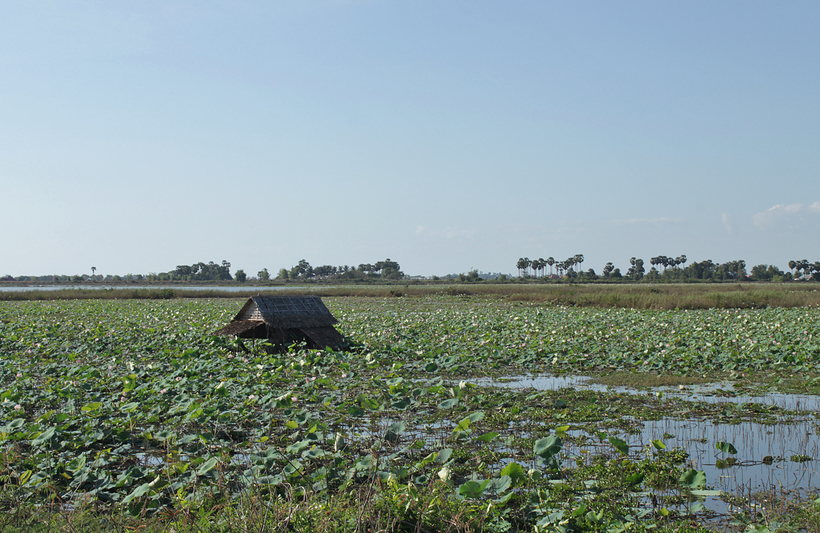 К самому берегу озера не подъехать – четкой береговой линии нет, так как озеро сильно меняет свои очертания и разливается во время сезона дождей, увеличивая свою площадь в несколько раз. В нескольких километрах от озера в небольшом заливе оборудован лодочный порт. Именно туда приводит дорога, проложенная по дамбе, и там на импровизированной стоянке я оставил велосипед. Вдоль всей дамбы протянулась деревня, все дома которой построены на сваях, а по сторонам виднеются рыбацкие лодки и целые поля цветущих лотосов.