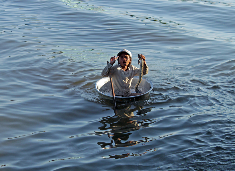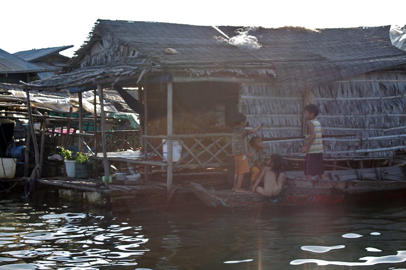 Таких деревень на озере множество. По разным подсчетам на озере проживает от 200000 до 1 миллиона человек. Некоторые деревни населены нелегалами из соседних стран, в основном из Вьетнама. Им запрещено селиться на земле, поэтому они и живут в плавучих домах, а то и больших лодках. Нам показали одну такую семью - на меня произвело сильное впечатление, когда к нам подплыла молодая женщина-вьетнамка с двумя маленькими детьми на крохотной моторной лодочке. Она о чем-то поговорила с хозяином нашей лодки, купила канистру бензина и снова устремилась в бескрайнюю даль, скитаться по водной глади. И так всю жизнь.